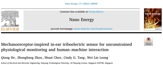 原文详情:He, Q., Zhou, Z., Chen, S., Tang, C. G., & Leong, W. L. (2023). Mechanoreceptor-inspired in-ear triboelectric sensor for unconstrained physiological monitoring and human–machine interaction. Nano Energy, 108900.