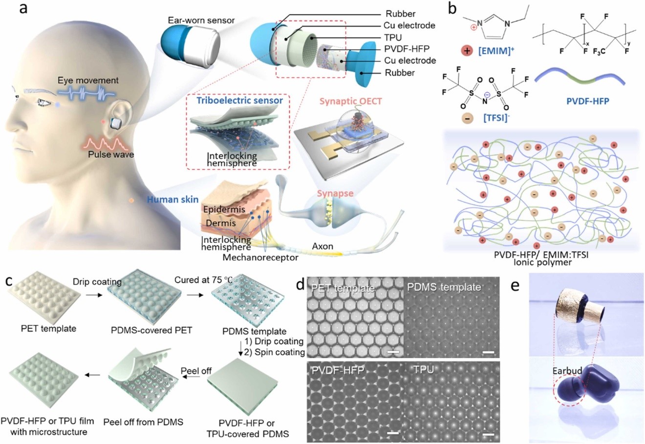 耳戴式设备由于其稳定的佩戴位置和与耳道的良好贴合的结构,具有非侵入性、不显眼、固定牢固、减少运动伪影等众多优点,从而使其成为有效解决问题的理想解决方案。新加坡南洋理工大学(NTU) Wei Lin Leong团队提出了提出了一种受机械感受器启发的耳戴式摩擦电传感器,它可以实现不受约束的面部表情监测,例如眼睛和嘴巴的运动,以及演示仅基于眼球运动的免提打字系统。低功耗有机电化学晶体管的集成高输出电流可以将摩擦电传感器的电流信号放大至少3个数量级,从而能够准确提取耳道内脉搏波刺激的微小压力变化。此外,有机电化学晶体管赋予的信号保留能力可实现扩展的控制模式,这在眼触发音乐播放控制系统中得到了证明。该工作展示了耳戴式摩擦电传感器在无障碍健康监测和无缝人机交互方面的巨大潜力。
