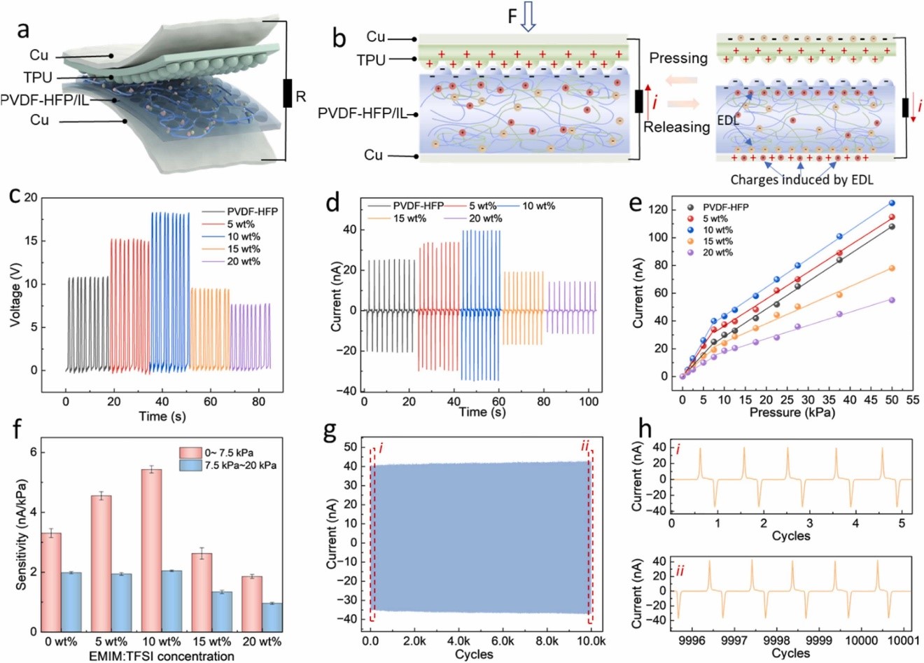 图2 . PILTS的工作机理和电气性能。a,具有互锁结构的摩擦电传感器的方案。b,摩擦电传感器工作机制示意图。c,不同 IL 浓度下 PILTS 的电压和 d,电流。e,不同IL浓度的PILTS在不同力下的电流响应。f,不同IL浓度的PILTS的灵敏度。g,PILTS在7.5 kPa的力下10,000次循环的稳定性。h,稳定性波形的第一个和最后几个周期。