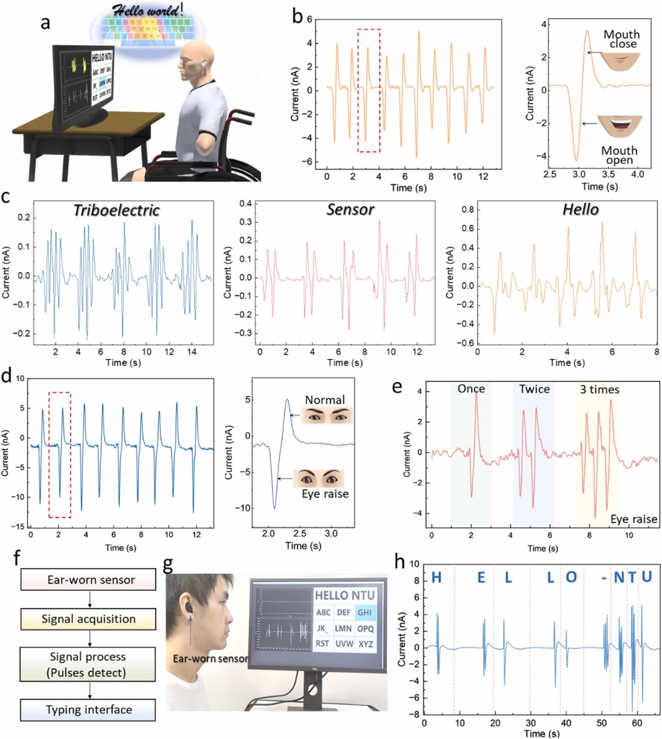 图3 . 耳戴式 PILTS 可监控嘴和眼的运动,从而实现免提打字系统。a、通过耳戴式PILTS与世界交流的示意图。b,张嘴和闭嘴时PILTS的电流。c,当说“Triboelectric”、“Sensor”和“Hello”时耳戴式传感器的电流输出。d,眼睛向上和向下时的 PILTS 电流。e、眼睛抬起一次、两次、三次时的PILTS电流。f,通过耳戴式PILTS实现的免提打字系统的框架图。g,基于 PILTS 的耳戴式免提打字系统的演示, 屏幕上的字是抬眼打出来的。h,免提打字系统演示中输入的信号和字母之间的对应关系。