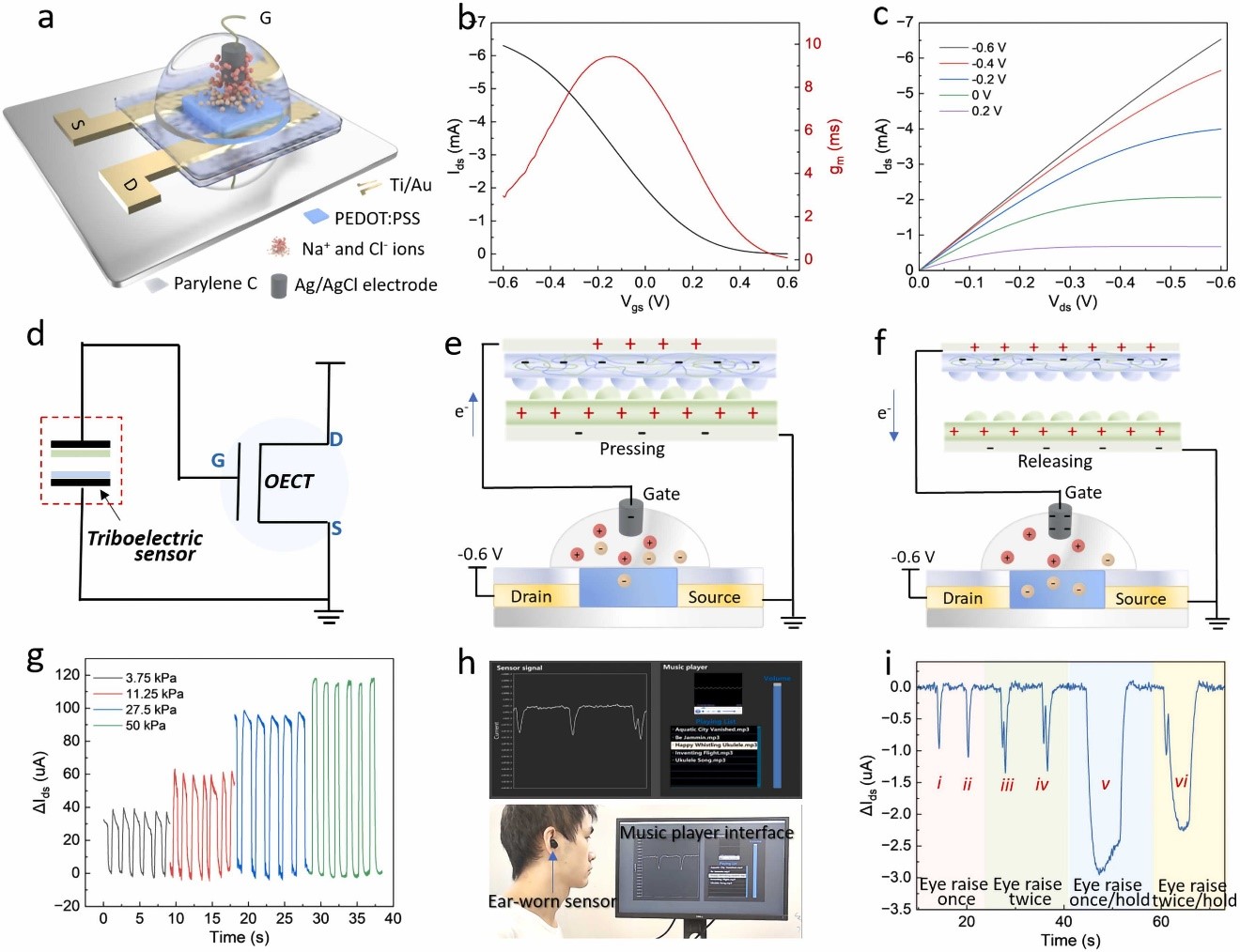 图4 . OECT集成的耳戴式 PILTS 在眼动音乐播放中的应用 a,OECT 器件架构方案,显示源极 (S)、漏极 (D) 和栅极 (G)。b,传输曲线,c,基于 PEDOT:PSS 的 OECT 的输出曲线。d,OECT集成摩擦电传感器电路图。e,当 PILTS 受压时器件的电荷分布,OECT 中较少的阴离子从电解质推入通道。f,PILTS释放时器件的电荷分布,OECT中更多的阴离子从电解质被推入通道,导致通道电导更高。g,不同力下OECT的电流输出。h、OECT集成的耳戴式PILTS音乐播放界面及演示。歌曲切换和音量控制是通过简单的眼动触发来实现的。i,眼触发音乐播放系统的信号与眼动之间的对应关系。