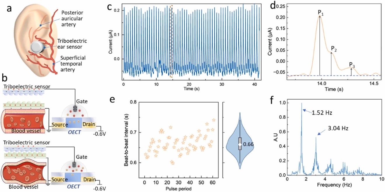 图5. OECT集成额耳戴式 PILTS 在耳内脉搏监测中的应用 a,带有 PILTS 集成耳机的耳朵示意图。b,示意图说明耳动脉刺激引起的电荷分布变化,导致 OECT 通道电导的调节。c,通过 OECT 集成耳戴式 PILTS 进行 40 秒连续耳内脉搏监测。d,一个脉冲周期内电流信号的放大图,具有 3 个峰值(P1-P3)。e,心率,f,根据 c 计算的 FFT。