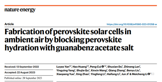 Yan, L., Huang, H., Cui, P. et al. Fabrication of perovskite solar cells in ambient air by blocking perovskite hydration with guanabenz acetate salt. Nature Energy (2023).