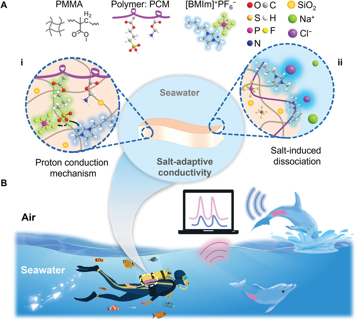 图1. 盐适应性导电离子凝胶的示意图,用于海下感知。© 1999-2023 John Wiley & Sons, Inc.