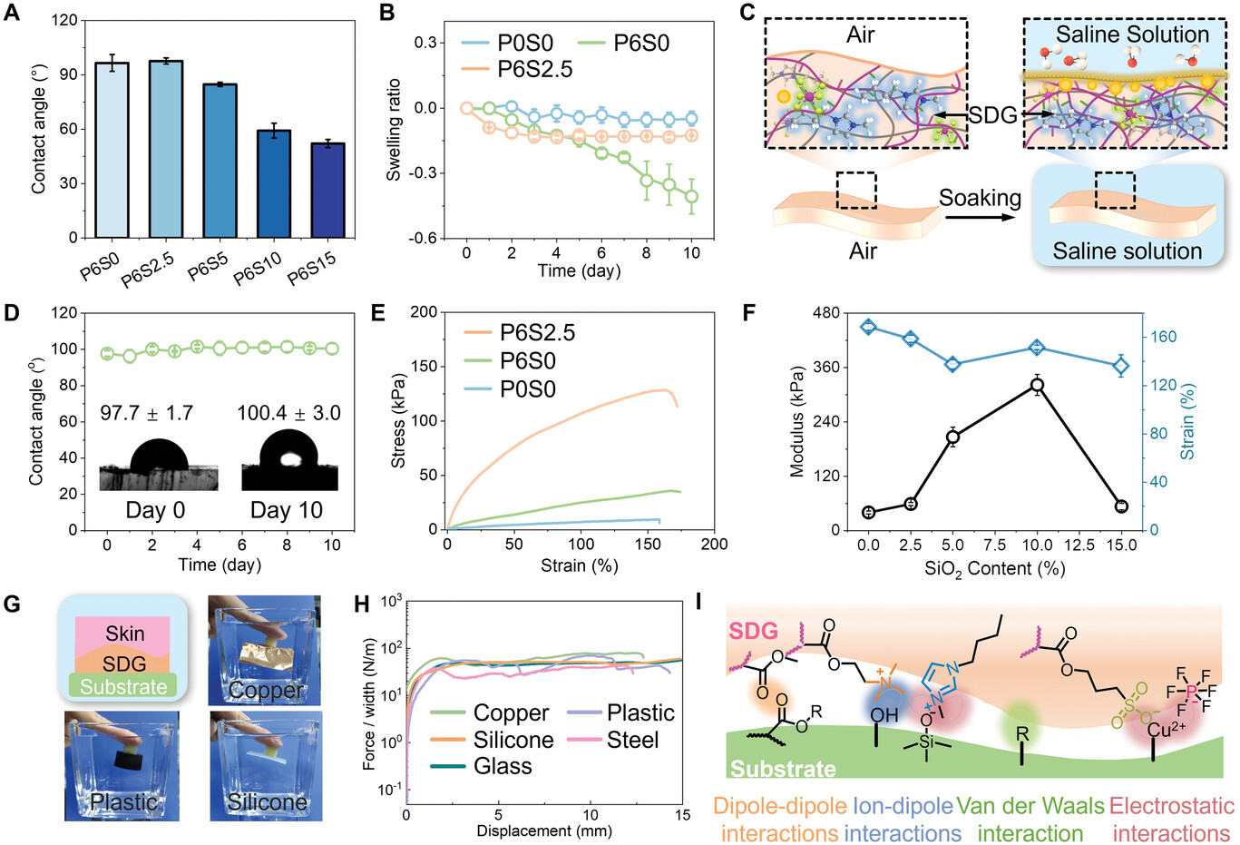 F) 具有不同SiO2 NPs含量的离子凝胶的机械性能。