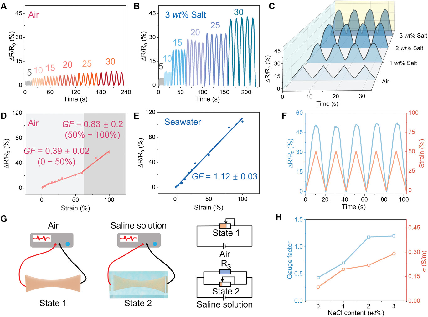 B) 在3 wt% NaCl溶液中,SDG基传感器在一系列应变下的相对电阻率。