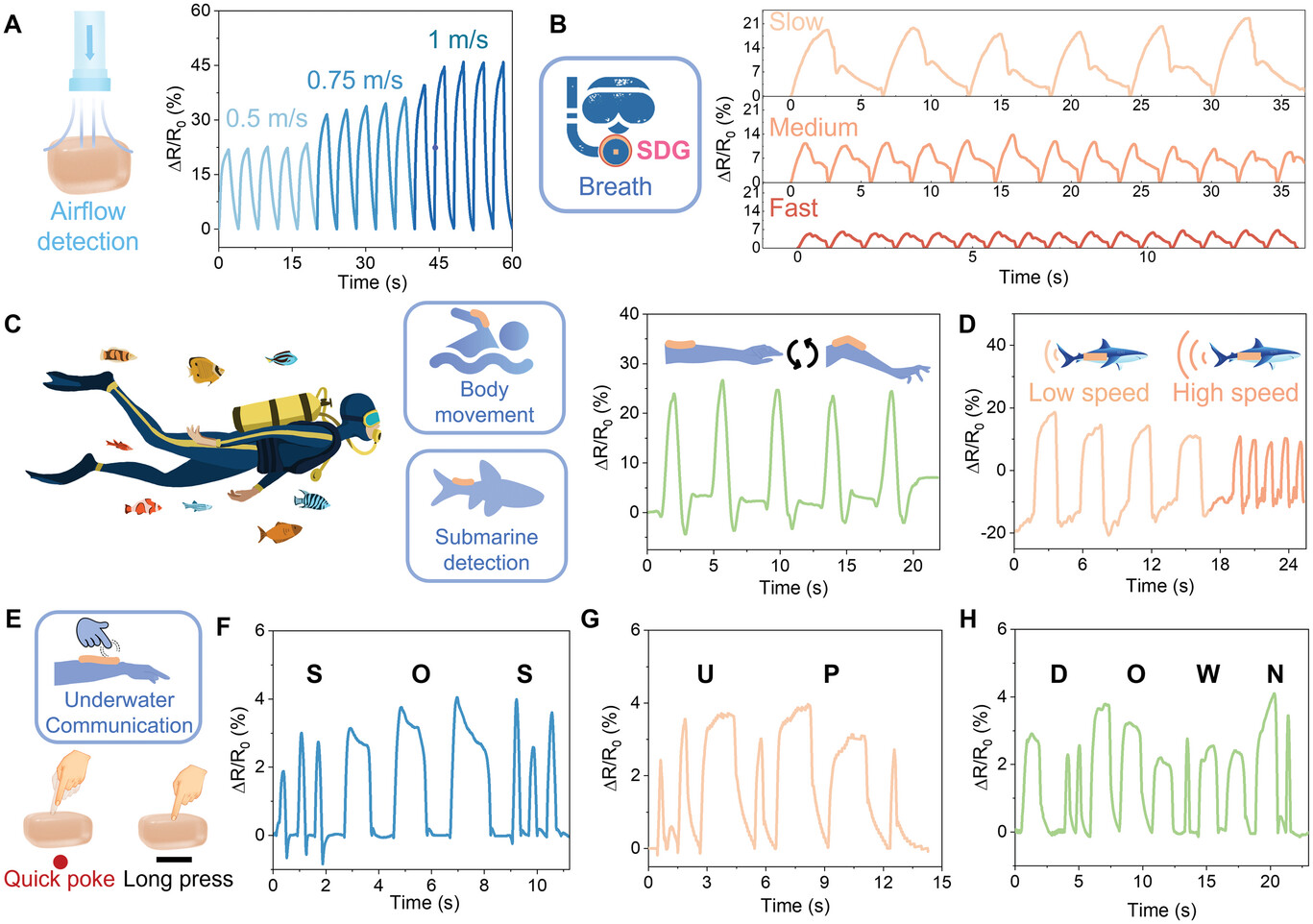 图 5. 基于SDG的传感器在海洋环境中用于监测呼吸频率、人类和鱼类运动以及水下通信的应用。© 1999-2023 John Wiley & Sons, Inc.