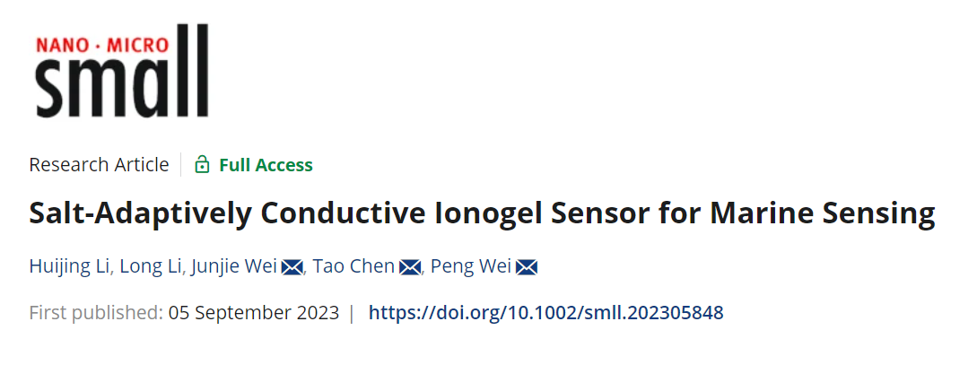 原文详情:Li, H., Li, L., Wei, J., Chen, T., Wei, P., Salt-Adaptively Conductive Ionogel Sensor for Marine Sensing. Small 2023, 2305848. https://doi.org/10.1002/smll.202305848