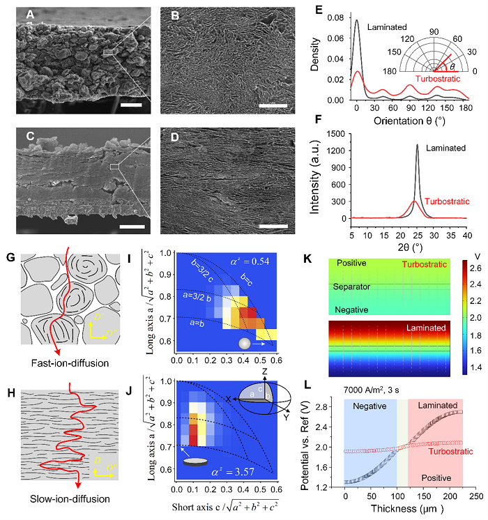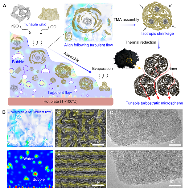 石墨烯片层取向直接影响离子传输速度,而石墨烯片层在毛细力和π-π相互作用下倾向于平行、有序堆叠,导致离子扩散距离随电极厚度呈指数式增长,严重限制了离子传输速度。传统的调整石墨烯片层取向的方案如模版诱导、机械剪切、磁场驱动、定向冷冻等存在电极密度低、难以大规模制备等缺陷。受沸腾茶水中茶叶随水流运动启发,本文提出利用沸腾流体中湍流流动产生的流场驱动石墨烯片层取向,实现石墨烯片层由平行、有序叠层向涡轮状排列的转变。取向后的石墨烯片层分布与流场分布高度一致(如图1 B, C),片层取向散布在0~180度之间,其离子扩散能力提高了5.4倍,显著提升了石墨烯电极在储能器件中的性能表现。