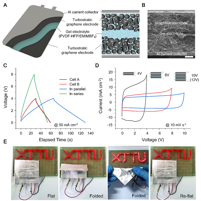 涡轮石墨烯展示出优异的储能特性。相比叠层石墨烯,涡轮石墨烯展现出更高的离子电导率、容量和更好的倍率特性,同时兼具高密度。同时,通过改变前驱体比例调控涡轮石墨烯微结构,可对材料电化学性能进行调控,本文系统阐述了材料微观结构、电极宏观形貌及器件电化学性能之间的关系。涡轮石墨烯电极密度可达 1.12 g cm-3,体积电容可达 234 F cm-3,电芯能量密度可达 83.2 Wh L-1,功率密度可达 14 kW L-1,是电容储能领域的一个里程碑。以涡轮石墨烯电极制备的软包固态超级电容单体,具有多种输出选择,在弯折状态下无漏液,展示了涡轮石墨烯电极在柔性储能器件制造方面的潜力。