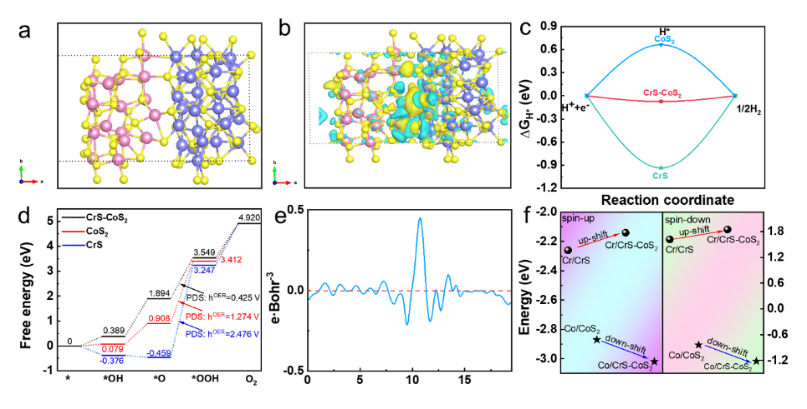 图5 (a)几何优化后CrS/CoS2异质结的结构模型;(b) CrS/CoS2异质界面的三维电荷密度差为0.0012e·Bohr-3;CoS2、CrS和CrS/CoS2异质结上的 (c)HER和 (d) OER处理的自由能图;(e) CrS/CoS2异质结的平面平均电子密度差;(f) CrS/CoS2异质界面形成后Co位和Cr位d带中心的变化。