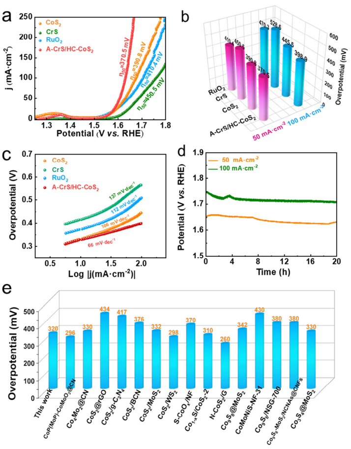 图4 A-CrS/HC-CoS2、CoS2、CrS和RuO2的 (a) OER的LSV曲线;(b) 过电位和 (c) Tafel图;(d) A-CrS/HC-CoS2在50mA·cm-2和100 mA·cm-2中的OER稳定性测试;(e) A-CrS/HC-CoS2和其他先前报道的电催化剂在10 mA·cm-2下的OER过电位的比较。