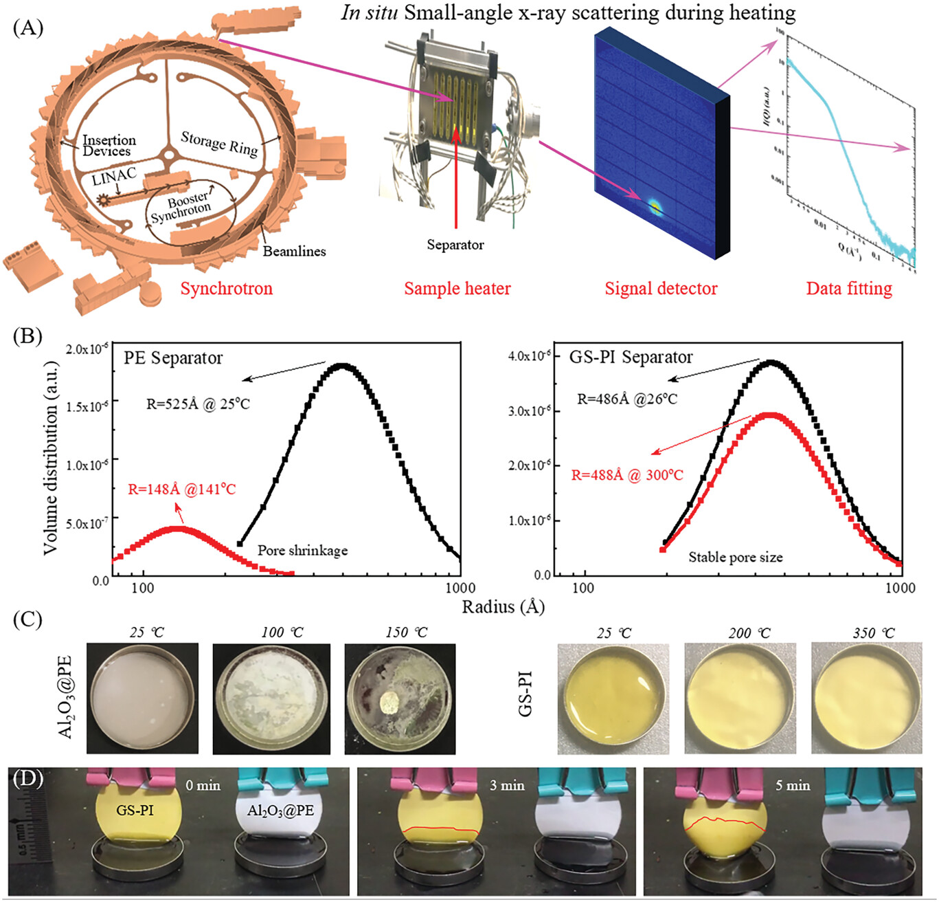 B) 从原位SAXS表征中获得的PE和GS-PI隔离层在加热过程中的孔径演变。