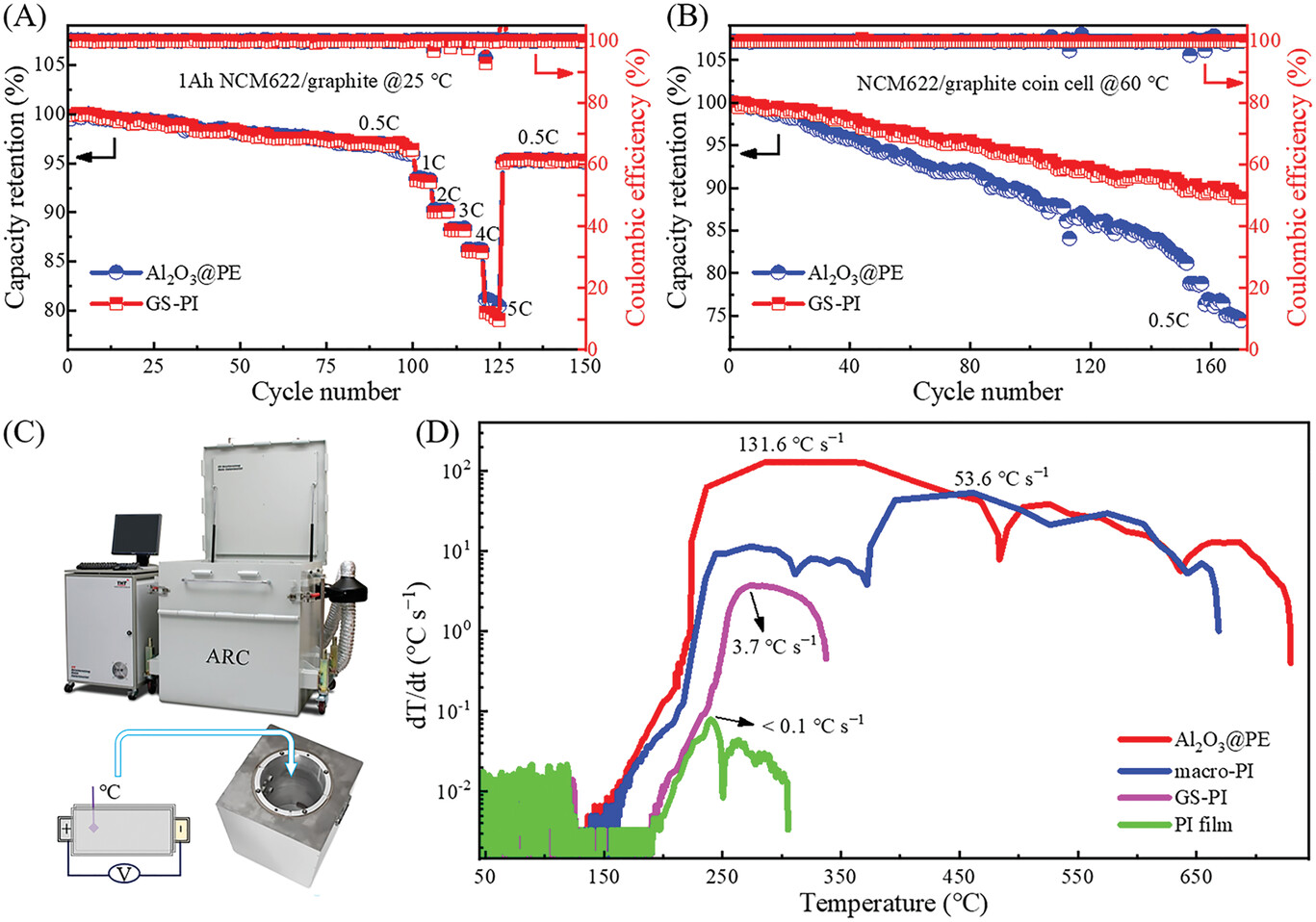 A) 在室温下,使用Al2O3@PE和GS-PI隔离层的1Ah NCM622/石墨袋式电池的循环稳定性和倍率放电容量。测试采用恒定电流(5C)-恒定电压(4.2V,截止于0.05C)充电和恒定电流放电(从0.5C到5C)模式。
