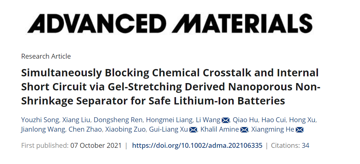 原文详情:Song, Y., Liu, X., Ren, D., Liang, H., Wang, L., Hu, Q., Cui, H., Xu, H., Wang, J., Zhao, C., Zuo, X., Xu, G.-L., Amine, K., He, X., Simultaneously Blocking Chemical Crosstalk and Internal Short Circuit via Gel-Stretching Derived Nanoporous Non-Shrinkage Separator for Safe Lithium-Ion Batteries. Adv. Mater. 2022, 34, 2106335.