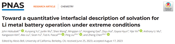 原文详情:Toward a quantitative interfacial description of solvation for Li metal battery operation under extreme conditions (PNAS 2023, 120, e2310714120)