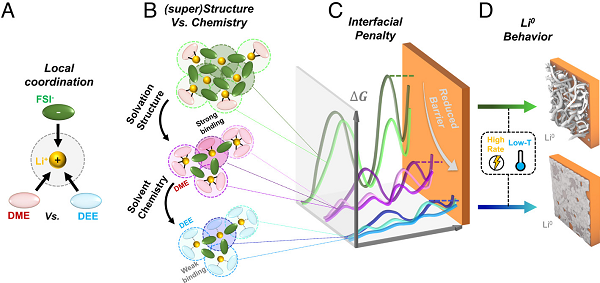 (A)局部和(B)长程Li+溶剂化态的交织效应及其对(C)界面处的去溶剂化动力学和(D)动力学应变下的Li金属循环行为的影响。