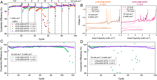 (A)采用LHCE系统的Li||Cu电池的可变速率CE。
