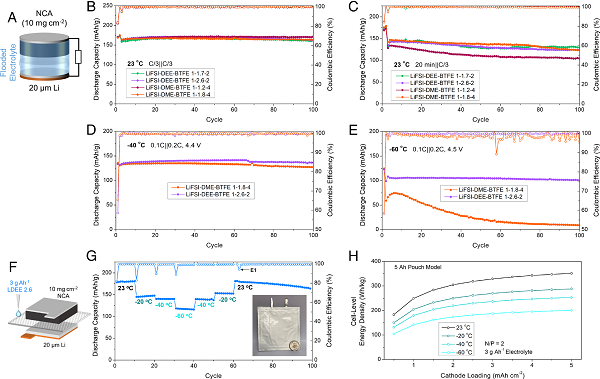 (B-E)电池分别在以下条件下的循环性能:(B)23 ℃,C/3充电||C/3放电和4.3 V截止电压;(C)23℃,20分钟充电||C/3放电和4.3 V截止电压;(D)-40℃,0.1C||0.2C和4.4 V截止电压;(E)-60℃,0.1C||0.2C和4.5 V截止电压。