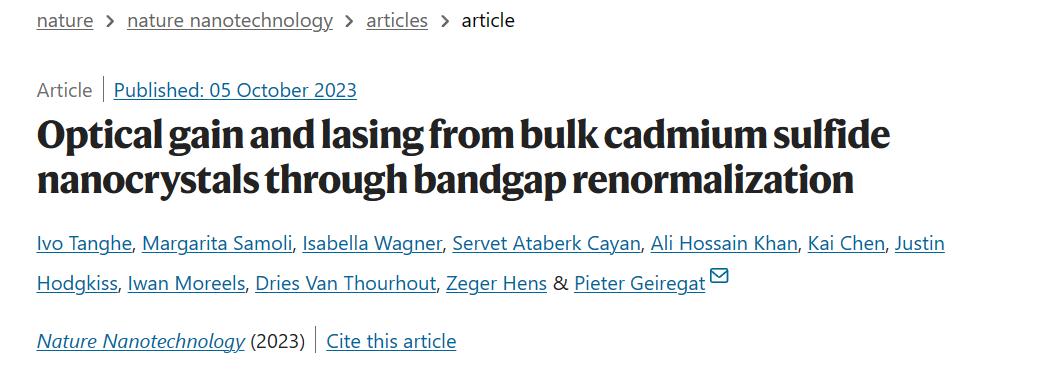 原文详情:Ivo Tanghe, Margarita Samoli, Isabella Wagner, Servet Ataberk Cayan, Ali Hossain Khan, Kai Chen, Justin Hodgkiss, Iwan Moreels, Dries Van Thourhout, Zeger Hens, Pieter Geiregat, Optical gain and lasing from bulk cadmium sulfide nanocrystals through bandgap renormalization. Nature Nanotechnology (2023).