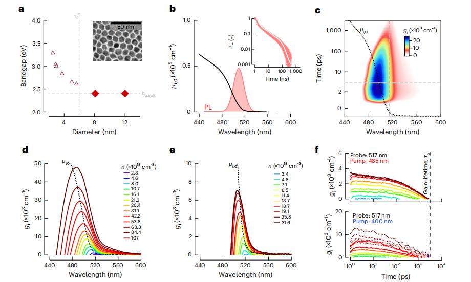 图5. CdS体相纳米晶的增益阈值和动力学 ©2023 Springer Nature
