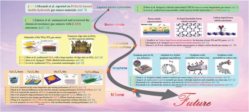 图1 气体传感应用的各种材料(层状双氢氧化物、氮化硼、过渡金属双卤化物、石墨烯和MXenes)的主要研究代表性工作。