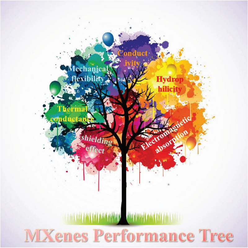 图2 MXenes性能树,具有快速的电荷转移通道(电导率)、丰富的端效应基团(羟基和氧基带来良好的亲水性)、机械灵活性、导热系数和电磁吸收屏蔽效应。