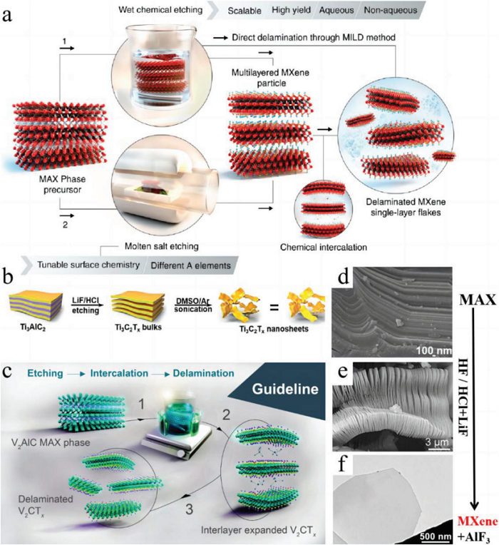 图4 a) 通过从MAX相和相关的层状化合物中去除a层来生产MXenes的两种方法的示意图。用溶液蚀刻法合成的MXene示意图:b) Ti MXene;c) V-MXene。 V2AlC2 MAX相与HF生产V2CTx MXene。通过HF蚀刻合成MXenes的过程: d) MAX相(Mn+1AXn)层状结构,e) 剥离原子层产生弱结合的MXenes多层,f) 通过分层形成单层或几层的MXenes。
