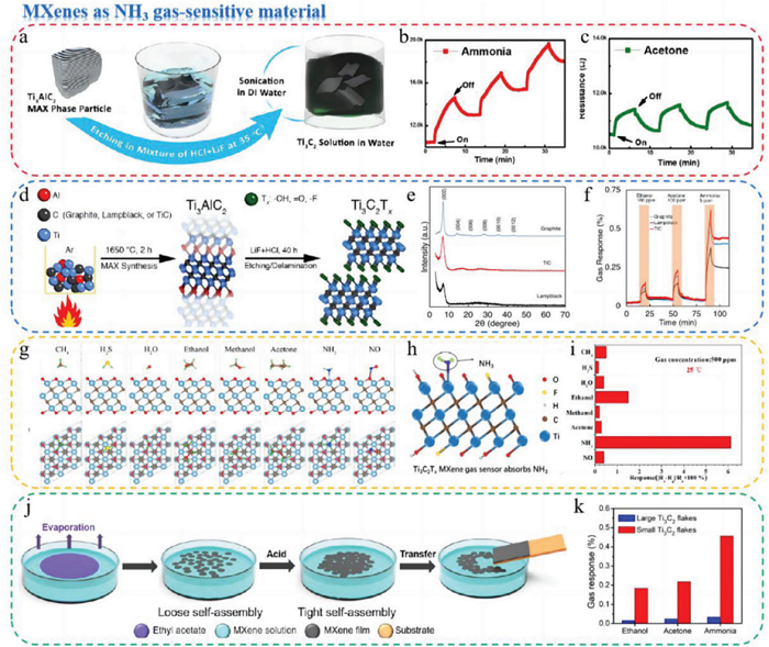 图6 a) Ti3C2TX的合成工艺图。b) 100 ppm丙酮和c)在室温下(25°C)的100 ppm的Ti3C2Tx基装置的气体传感性能。d) Ti3AlC2使用不同的碳源(TiC、石墨和碳油烟)合成,然后使用Ti3C2Tx MXene。e) 使用不同碳源生产的MXene薄膜的XRD模式,显示薄膜质量存在显著差异。f) 用不同MAX前驱体制备的Ti3C2Tx的气体传感性能。这三种麦克己烯对乙醇、丙酮和氨表现出不同的敏感性。g) 不同气体分子吸附在Ti3C2O2表面的最稳定的构型。h) Ti3C2Tx MXene气体传感器,吸收氨。i) Ti3C2 MXene传感器在甲烷、硫化氢、水、乙醇、丙酮、500 ppm、乙醇、甲醇、丙酮、氨和NO室温(25°C)下的气传感测量。j) 用于制造超薄(纳米级)MXene薄膜的界面自组装方法图。k) 各类型薄膜与测试气体相关的气体响应