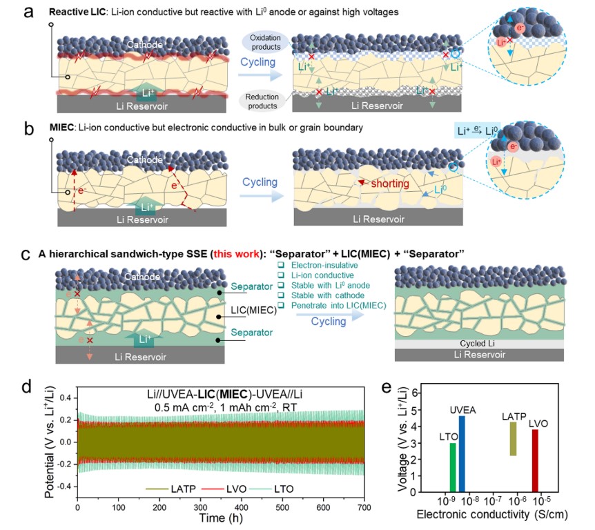 过去的固态电池研究中,寻找同时具有电子绝缘性、在低电压和高电压下稳定以及可持续性的固态离子导体是一个具有挑战性的任务。目前广泛使用的陶瓷锂离子导体在平衡所有这些标准方面存在困难,并且在应用于固态锂金属电池时选择有限。来自美国加州大学尔湾分校忻获麟教授团队提出了一种新的固态电解质设计范式,即在两个固态电子隔离层之间夹入陶瓷锂离子导体,以允许更广泛范围的陶瓷锂离子导体应用于固态锂金属电池,并解决陶瓷锂离子导体的电子绝缘性和(电)化学稳定性要求的问题。