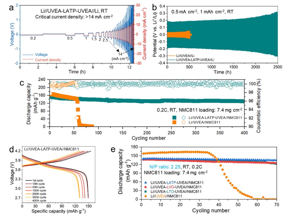 (a)室温下在Li//Li对称电池中测试的UVEA -LATP-UVEA的临界电流密度