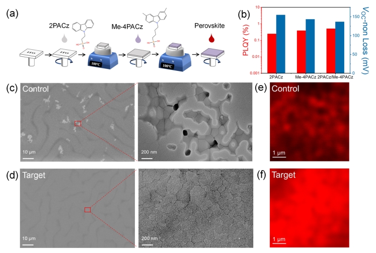 提出了一种简单明了的界面工程策略,即顺序沉积2PACz和Me-4PACz作为空穴选择层,通过控制钙钛矿的结晶过程和埋底界面的电荷载流子传输,抑制非辐射电荷复合。