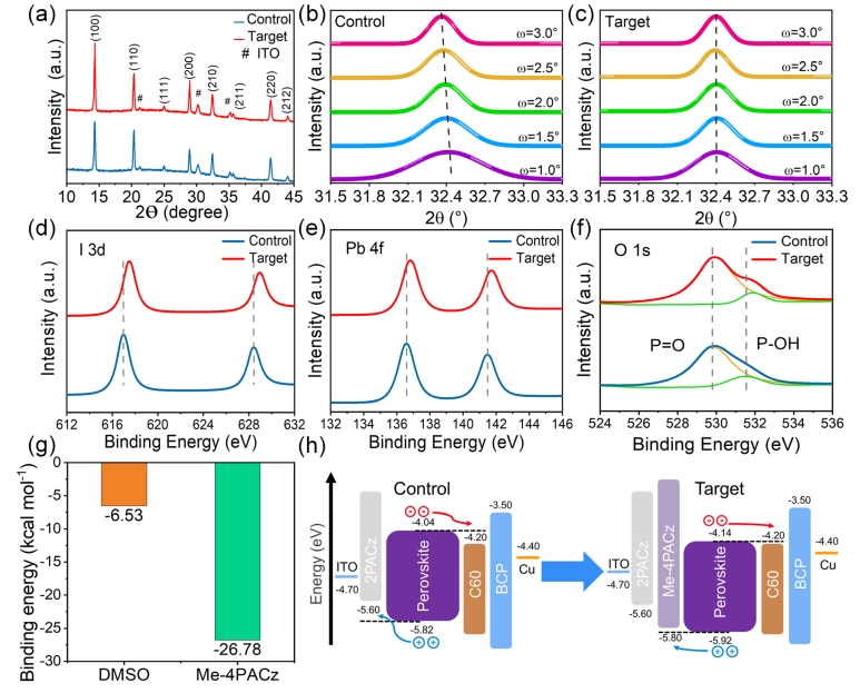 (b,c) 不同掠入射角下,对照钙钛矿膜和目标钙钛矿膜的GIXRD光谱;