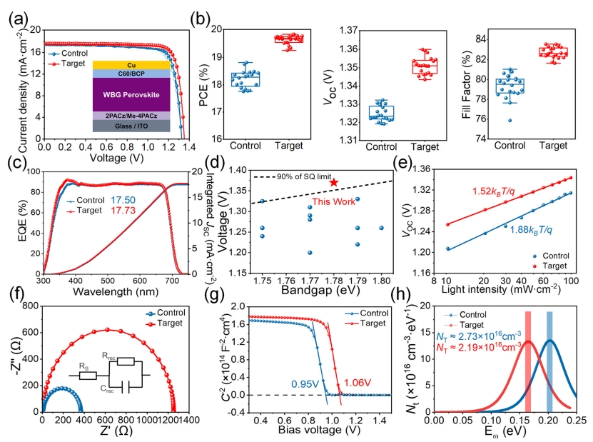 (b) 对照组和目标组的设备性能参数(VOC、FF和PCE)方框图;