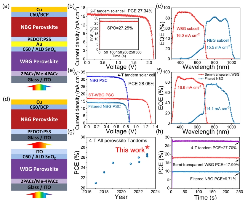 (g) 4-T全钙钛矿串联太阳能电池的PCE演变;