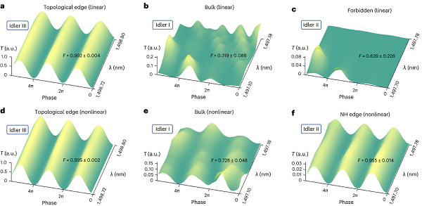 (a-f)分别在两个拓扑模式和NH边缘模式之间进行光学干涉测量。