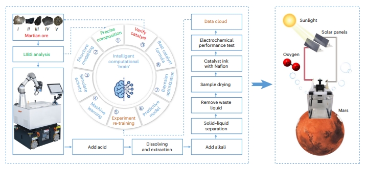 在火星上生活需要从当地火星资源中合成对生存至关重要的化学物质,比如氧气。然而,这是一项具有挑战性的任务。中国科学技术大学罗毅教授、江俊教授、尚伟伟副教授团队与深空探测实验室张哲研究员等合作,采用中国科大机器化学家“小来”平台自动合成和智能优化火星陨石中氧气析出反应的催化剂。整个过程,包括火星矿石预处理、催化剂合成、表征、测试,最重要的是寻找最佳催化剂配方,都是在无人为干预的情况下进行的。使用基于第一性原理计算数据和实验测量的机器学习模型,该方法可以从超过300万种可能的组合中自动快速地识别出最佳催化剂配方。合成的催化剂在电流密度为10mA cm-2的情况下运行超过550,000秒,过电位为445.1mV。该工作证明了人工智能化学家在火星探测化学品和材料自动合成中的可行性。研究成果以“Automated synthesis of oxygen-producing catalysts from Martian meteorites by a robotic AI chemist”为题发表在Nature Synthesis上。