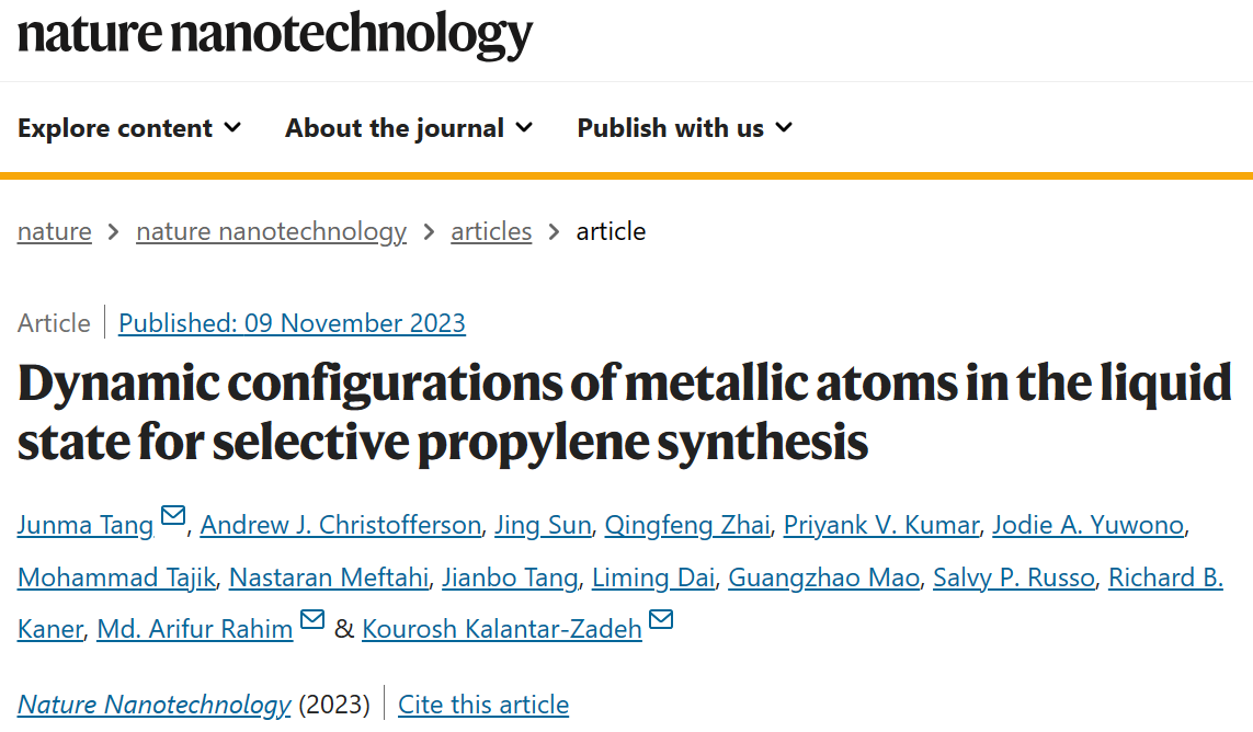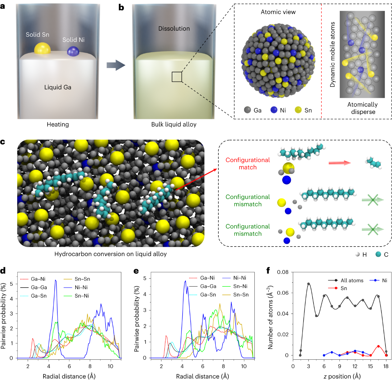 近日,悉尼大学Md. Arifur Rahim和Kourosh Kalantar-Zadeh研究团队为了深入了解液态金属催化剂的机理,展示了一种GaSn0.029Ni0.023液态合金,可用于不同烃源化合物选择性合成丙烯。由于可迁移性,液态Sn, Ni和Ga原子的动态自主定位可以产生特定的构型。实验分析和计算模型证实了一种特殊的反应机制,通过这种机制,Sn从界面中突出,相邻的Ni在界面层下方与癸烷分子精确对齐,从而促进丙烯的产生。然后,将该反应途径应用于可再生烃菜籽油,丙烯选择性转化率达到了~94.5%。该研究结果提供了液态金属催化剂的机理解释,并展示了该技术实际应用的潜力。相关研究成果以“Dynamic configurations of metallic atoms in the liquid state for selective propylene synthesis”发表在期刊Nature Nanotechnology上。
