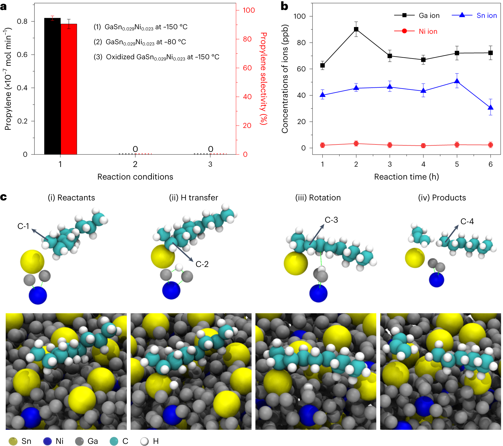 以GaSn0.029Ni0.023为催化剂,对不同烃源化合物选择性合成丙烯的机理进行了研究。Ga矩阵中原子构型的动态性质为与反应物的特定排列提供了机会,从而提供了选择性的反应途径。通过构型定向反应途径,在~150℃的温和加热下,烃类(包括癸烷和菜籽油)主要在GaSn0.029Ni0.023催化剂的界面上转化为丙烯。该反应体系还证明了从菜籽油转化合成丙烯的可扩展性和耐久性。该研究成果进一步开拓和加深了对于液态金属催化剂的理解,同时为以后液态金属催化剂的设计与合成提供了指导。