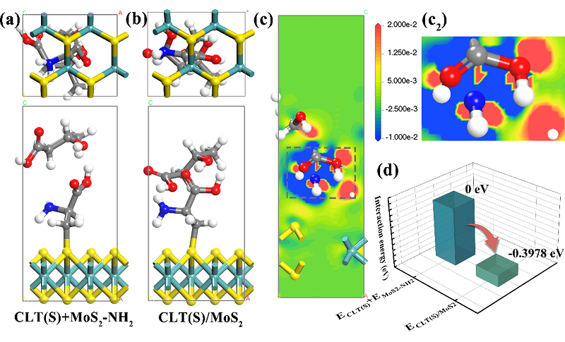 图3 (a) CLT(S)+MoS2-NH2相互作用的单位细胞模型;(b) CLT(S)/MoS2的优化晶胞模型;(c) CLT(S)/MoS2的电荷密度切片;(c2)为(c)中反应作用位点的局部放大图;(d) 计算出的CLT(S)+MoS2-NH2和CLT(S)/MoS2的相互作用能