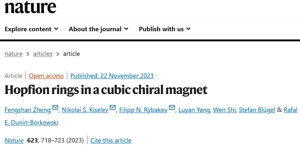 文献链接:Hopfion rings in a cubic chiral magnet (Nature 2023, 623, 718-723)