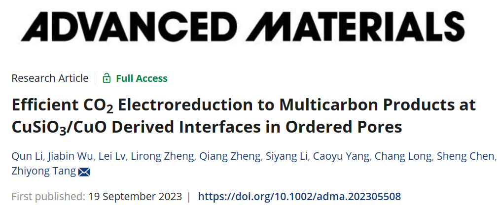 近日,中国科学院国家纳米科学与技术中心唐智勇院士等人开发了一种新的策略来解决上述难题,作者在有序多孔CuO涂覆CuSiO3(p-CuSiO3/CuO)作为CO2电化学还原反应(CO2RR)的催化剂,有效促进CO2的活化,降低关键中间体*OCCOH的形成能,从而促进CO2还原效率。p-CuSiO3/CuO的CO2电化学还原性能在−1.2 V条件下表现出77.8%的法拉第效率,在1 M KOH条件下为91.7%。研究成果以题为“Efficient CO2 Electroreduction to Multicarbon Products at CuSiO3/CuO Derived Interfaces in Ordered Pores”发表在知名期刊Advanced Materials上。