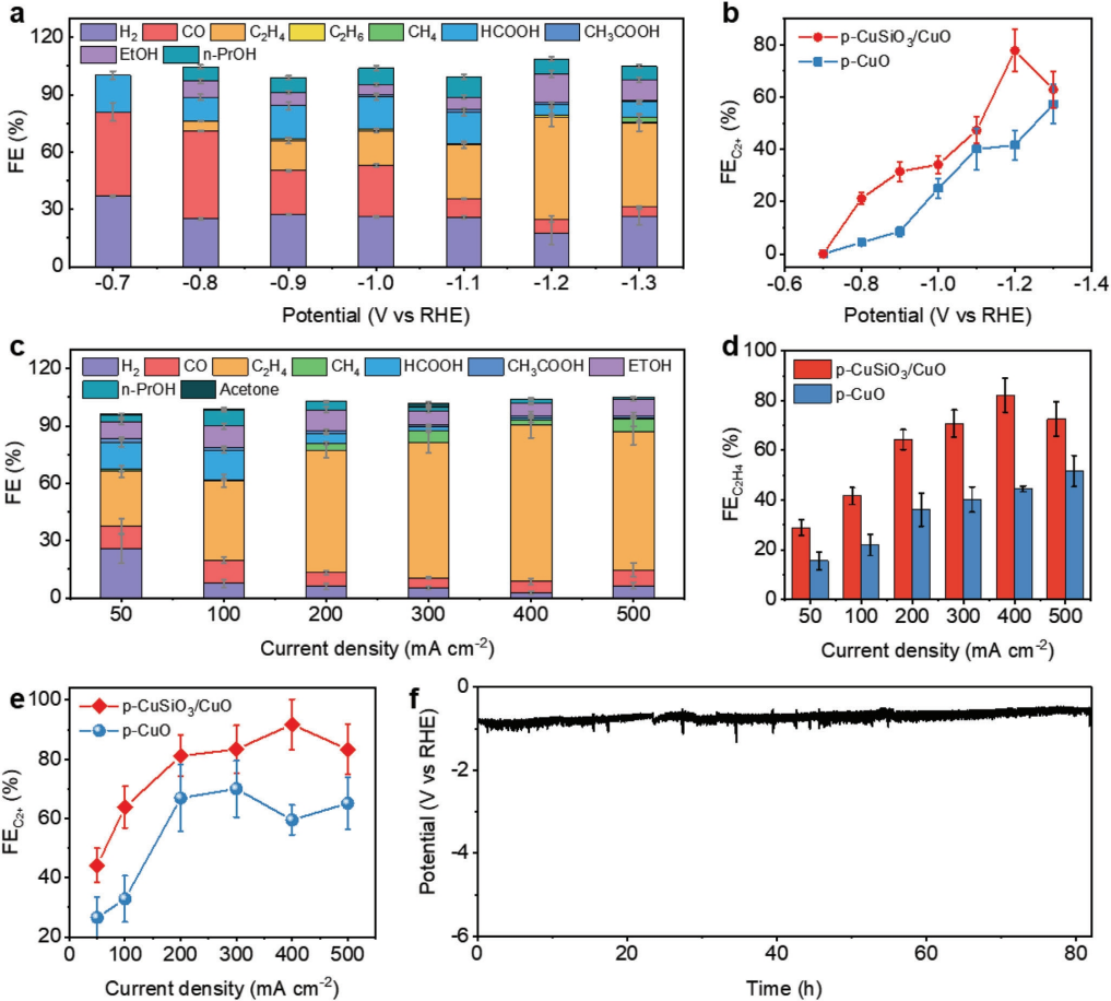 (d,e) 在不同电流密度下使用p-CuSiO3/CuO和p-CuO的流通池中的C2H4、C2+产物的FE。误差条表示三个独立测量的标准偏差(SD);