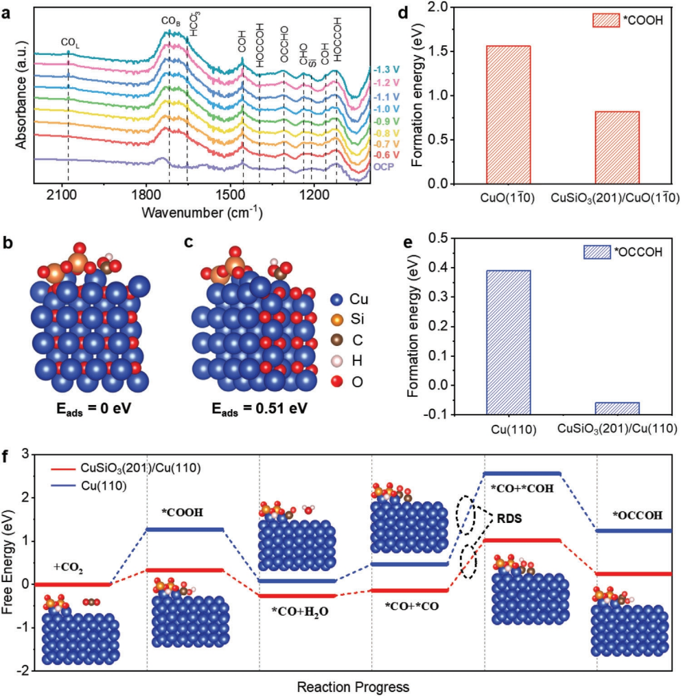 将有序多孔CuO涂覆CuSiO3上,开发出了高效的p-CuSiO3/CuO铜基复合物作为CO2电化学还原反应的催化剂,促进了CO2的活化和*OCCOH的形成过程。