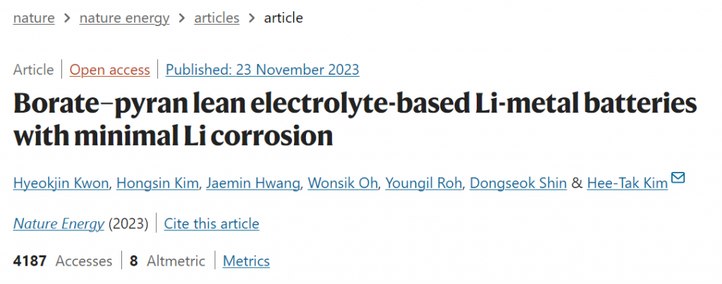 近日,韩国HTH官网地址 学院Hee-Tak Kim教授发表了相关论文,利用基于硼酸盐–吡喃的电解质来解决慢性锂腐蚀问题。硼酸盐–吡喃电解质通过将固体–电解质界面中的大的LiF微晶转化为细晶或玻璃状LiF,最大限度地减少电解质分子渗透到固体–电解质界面中,从而增强Li/电解质界面的钝性。基于硼酸盐–吡喃电解质、高镍层状氧化物阴极和薄锂组装的LMB可提供较高的初始全电池级能量密度(>400 Wh kg−1)和在E/C比为1.92 g Ah−1时运行400个循环,容量保持率为70%;在1.24 g Ah−1时运行350个循环,容量保持率为73%;在0.96 g Ah−1时运行200个循环,容量保持率为85%。第一作者为Hyeokjin Kwon,通讯作者为Hee-Tak Kim教授。相关文章以“Borate–pyran lean electrolyte-based Li-metal batteries with minimal Li corrosion”发表在Nature Energy上。