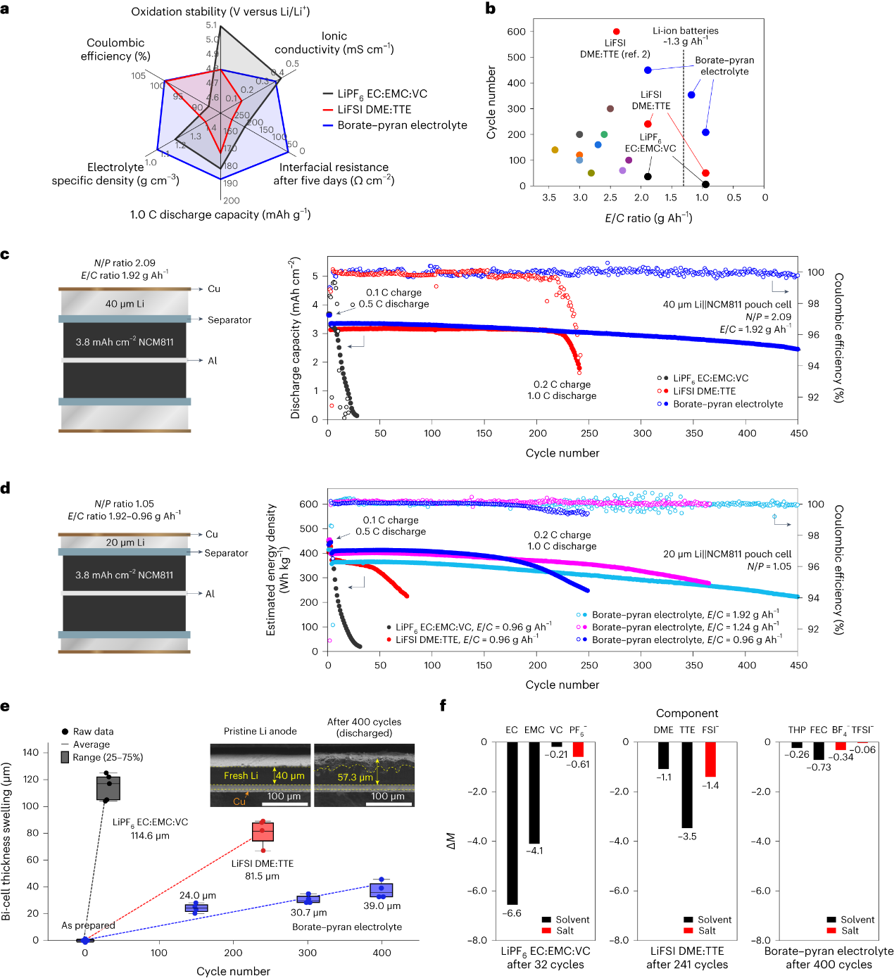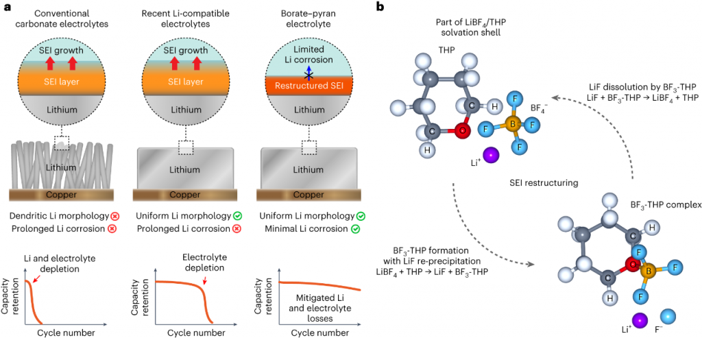 图1. 具有最小锂腐蚀的贫电解液LMB的电解液设计原则。a. 硼酸盐–吡喃电解质的电解液设计示意图。b. SEI重组的化学过程。 ©Springer Nature Limited
