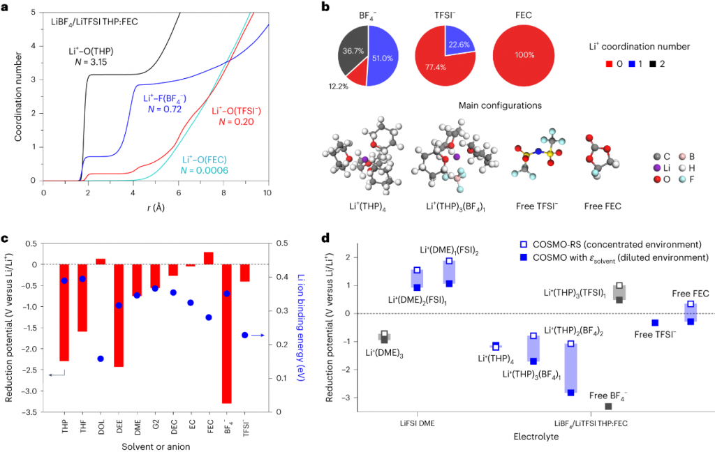 图3. 溶剂化结构和还原稳定性。a. MD模拟计算的径向分布函数获得的配位数(N)。 b. 硼酸盐–吡喃电解质中LiBF4、LiTFSI 和FEC的配位数分布,以及电解质结构的图片。c. 还原电势和锂离子和各种有机溶剂和阳离子的结合能。d. 典型醚类电解质 (LiFSI DME) 和硼酸盐–吡喃电解质 (LiBF4/LiTFSI THP:FEC) 的溶剂和盐构型的还原电势对比。 © Springer Nature Limited