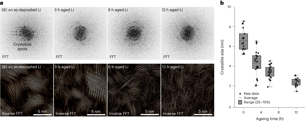 图6. LiF结构的研究。a. 硼酸盐–吡喃电解质中刚沉积及老化的Li上形成的SEI 层中LiF的FFT和逆FFT图像。b.晶体LiF的尺寸分布。 © Springer Nature Limited