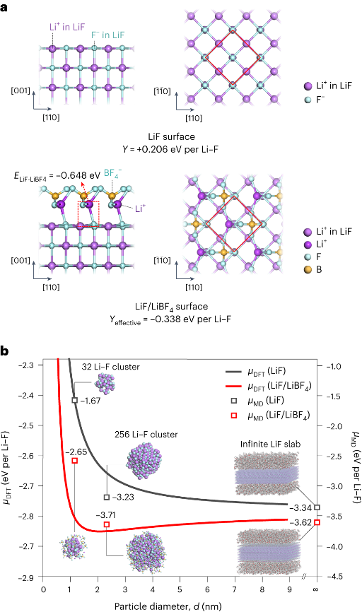图7. LiF重组的热力学可行性。a. LiF和LiBF4吸附表面(LiF/LiBF4)的原子结构和计算的有效表面能。b. DFT或MD模拟的LiF颗粒的化学势及其粒径。© Springer Nature Limited