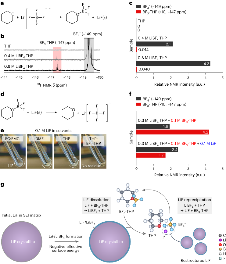 图8. BF3-THP介导的LiF重组。a. LiF沉淀形成BF3-THP的化学方程式。b. 19F NMR图谱。c. BF4–和BF3-THP的相对NMR强度。d. BF3-THP溶解LiF并形成THP和LiBF4的化学方程式。e. 添加0.1M LiF前后,0.3 M LiBF4THP中 0.1M BF3的相对NMR强度。f. LiF重组机制的示意图。 © Springer Nature Limited